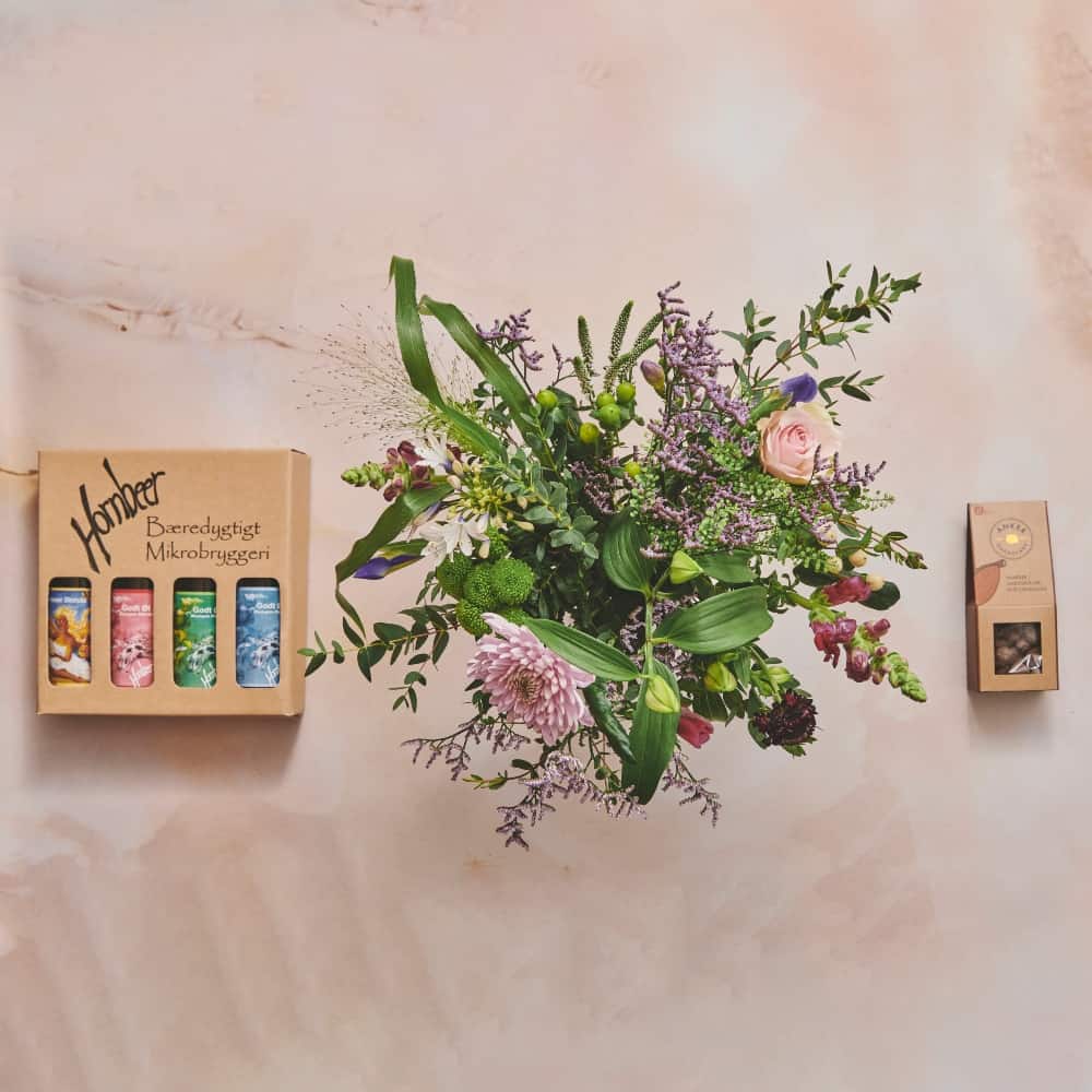 • Original: 1 x Dagens blomstermix + 1 x Gaveæske (4 stk. CO2 Neutrale øl fra danske Hornbeer (33 cl./flaske)) + 1 x Ankers Overtrukne Mandler (105g)