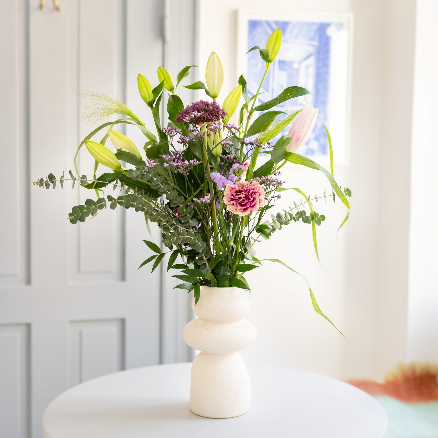 Buketten har et feminint og raffineret udtryk, med enkle linjer nærmest svævende sammensat af en kombination af liljer, grønt og nogle af sæsonens favoritter. Denne spændende kombination er en kreativ nyfortolkning af den klassiske liljebuket, dog med respekt for det fine og bløde udtryk, som klæder den populære blomst.