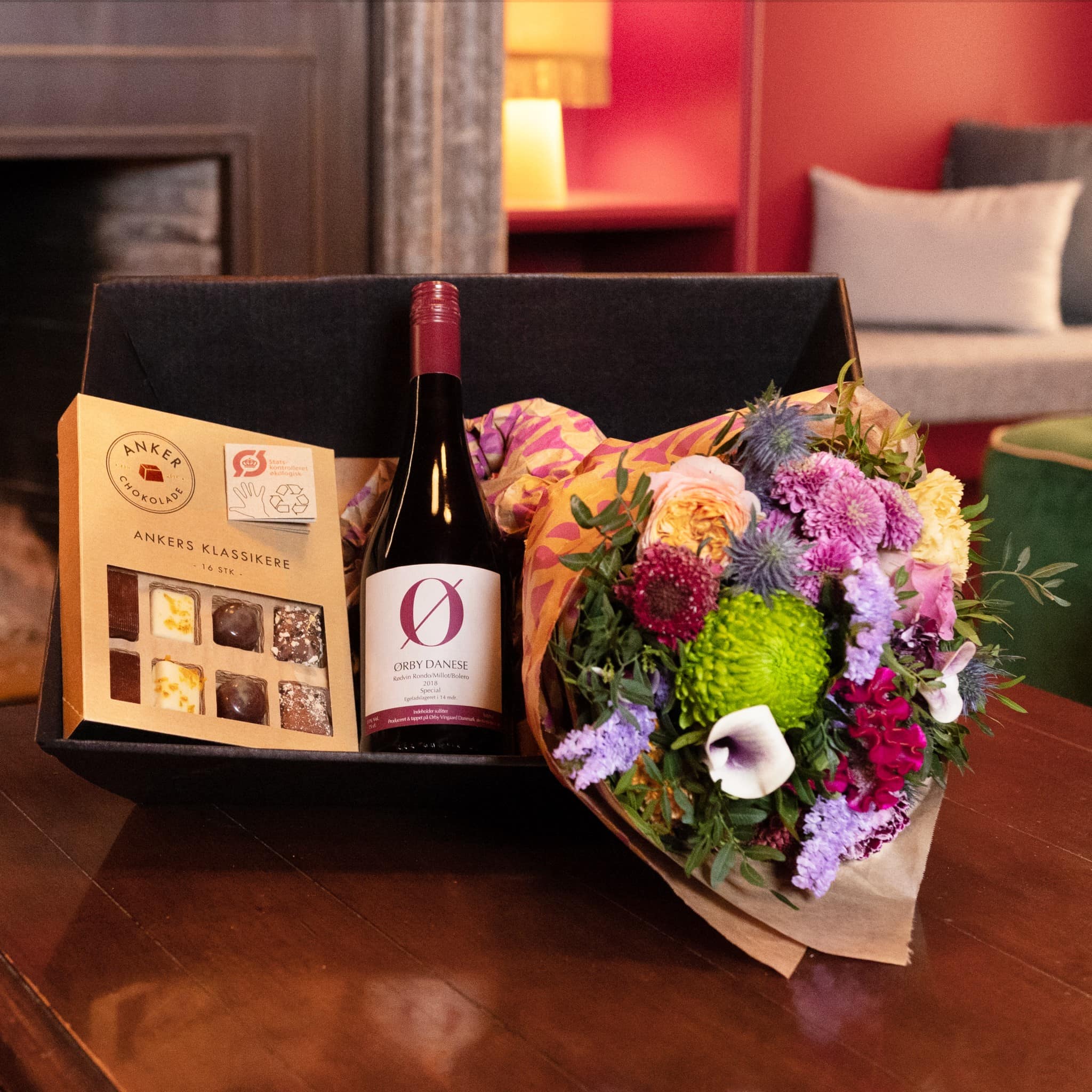 Rococo gavesæt er et gavesæt bestående af den graciøse rococo light blomsterbuket, 16 stk. økologiske fyldte chokolader fra Anker Chokolade og danskproduceret rødvin fra Ørby Vingaard. Et velsmagende og -duftende gavesæt.