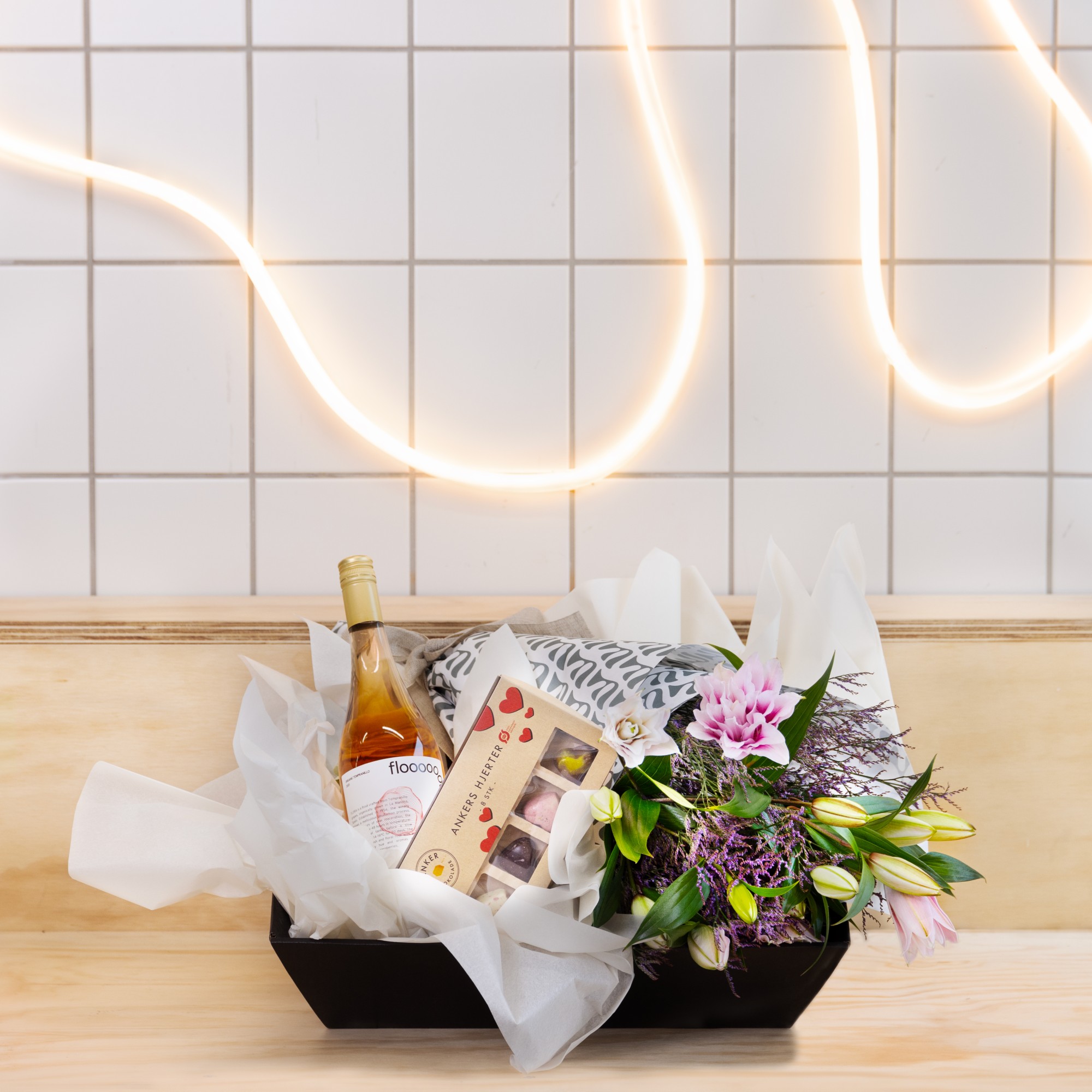 “’Tak for dig mor” er et gavesæt, der forkæler både ganen og synet. Sættet indeholder lækker økologisk chokolade fra Ankers Chokolade, en frisk flaske rosé og vores smukke ”For altid min mor” buket. Den perfekte måde at hylde mor og hendes kærlighed på i anledning af Mors Dag.